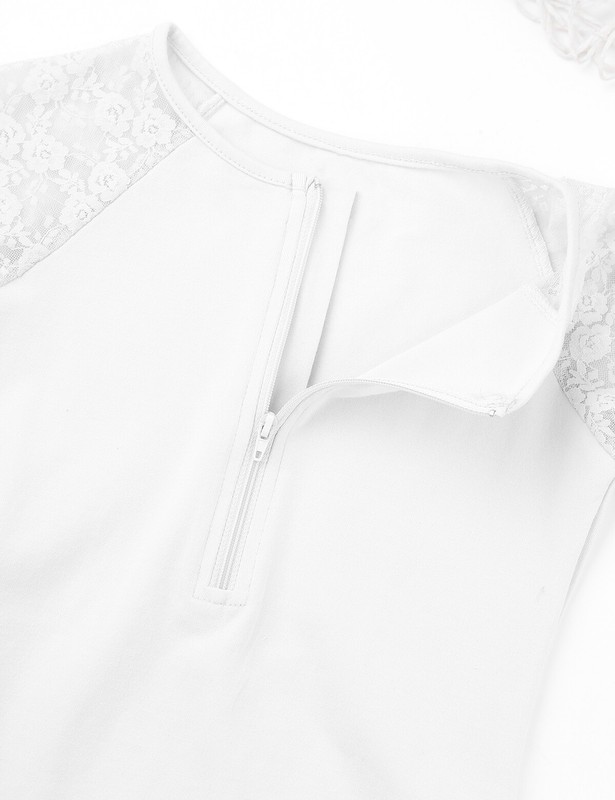 Floral lace long raglan sleeves, round neckline, front with zipper closure. Elastic ballet leg cut.