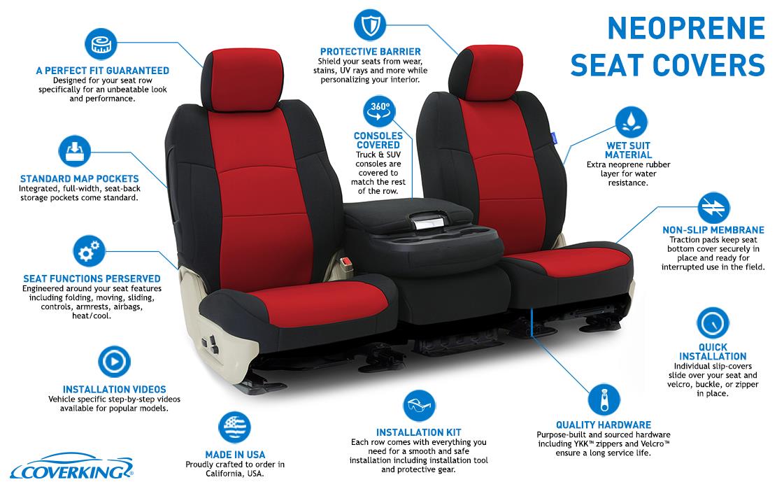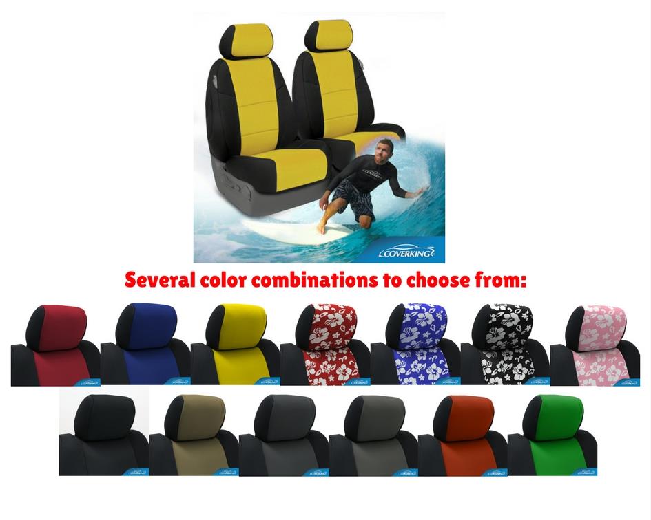 Our CR-Grade Neoprene Custom Seat Covers are made from the same quality material used in high-end wetsuits. These covers are extremely water resistant and very durable. Each cover also has a soft and cushioned feel while displaying a sporty design. Neoprene covers are the best fitting seat covers you can find in the market. These covers can be installed in less than 30 minutes and are made to custom-fit your vehicle to include headrest, armrest, *center console (split bench rows only), air bag cutouts and even map pockets (where applicable). Available in 13 designer colors and Hawaiian prints. You won’t find a more stylish or more durable product than our Neoprene seat covers.