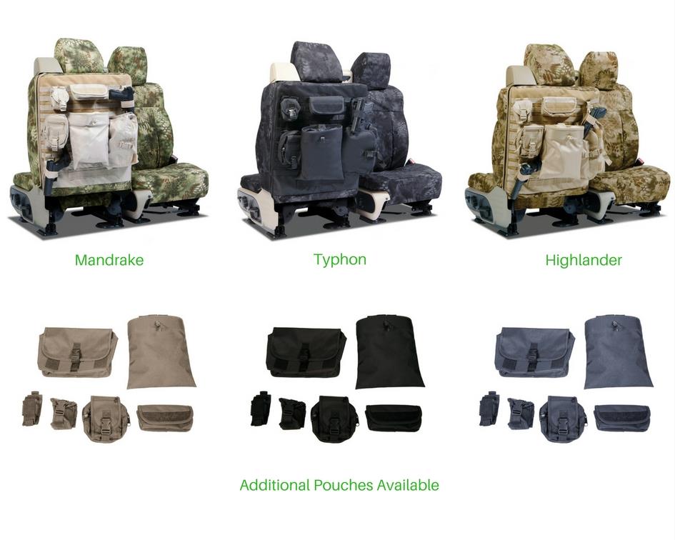 Rear seat covers are available on Tactical or NON-Tactical style. Tactical style comes with the MOLLE system and a set of 6 pouches, NON-Tactical style comes with a map pocket on the back. You can also purchase extra set(s) of Tactical Pouches for added storage capacity. Please, contact us if you have any questions.