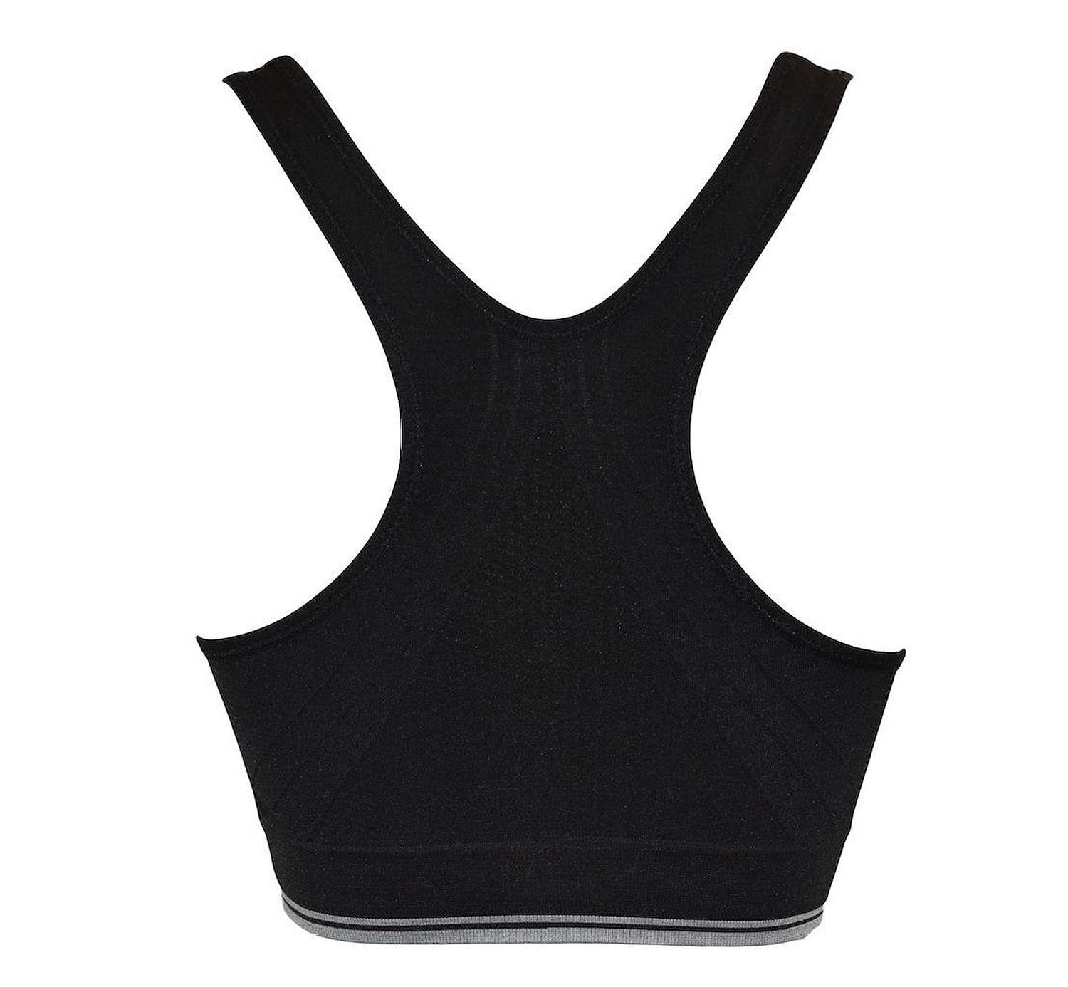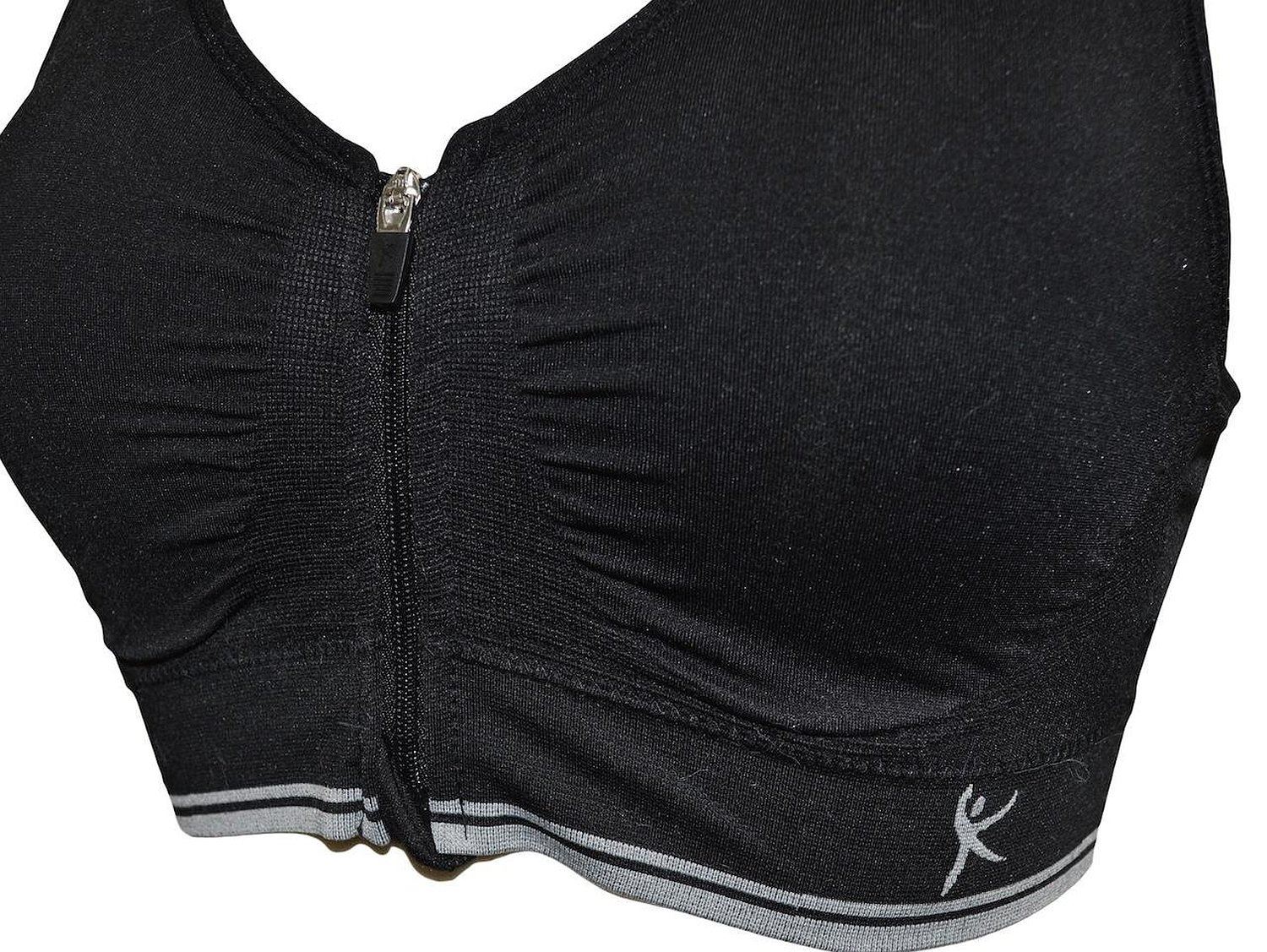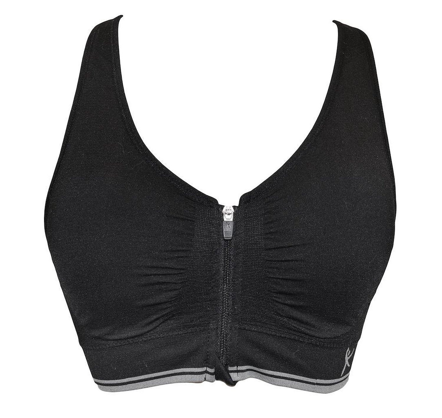 Danskin racer back women's seamless bra with front zipper accents. Features removable cups, knit-in texture for shaping and support, a knit-in ribbed hem.