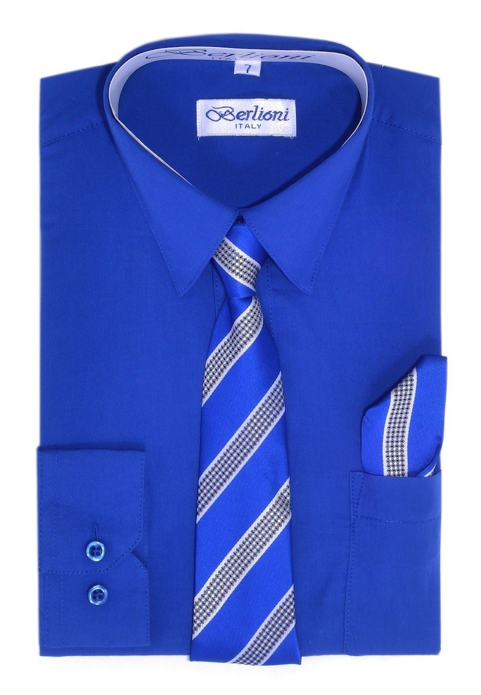 BERLIONI ITALY KIDS BOYS DRESS SHIRT LONG SLEEVE WITH TIE & HANKY SOLID ROYAL