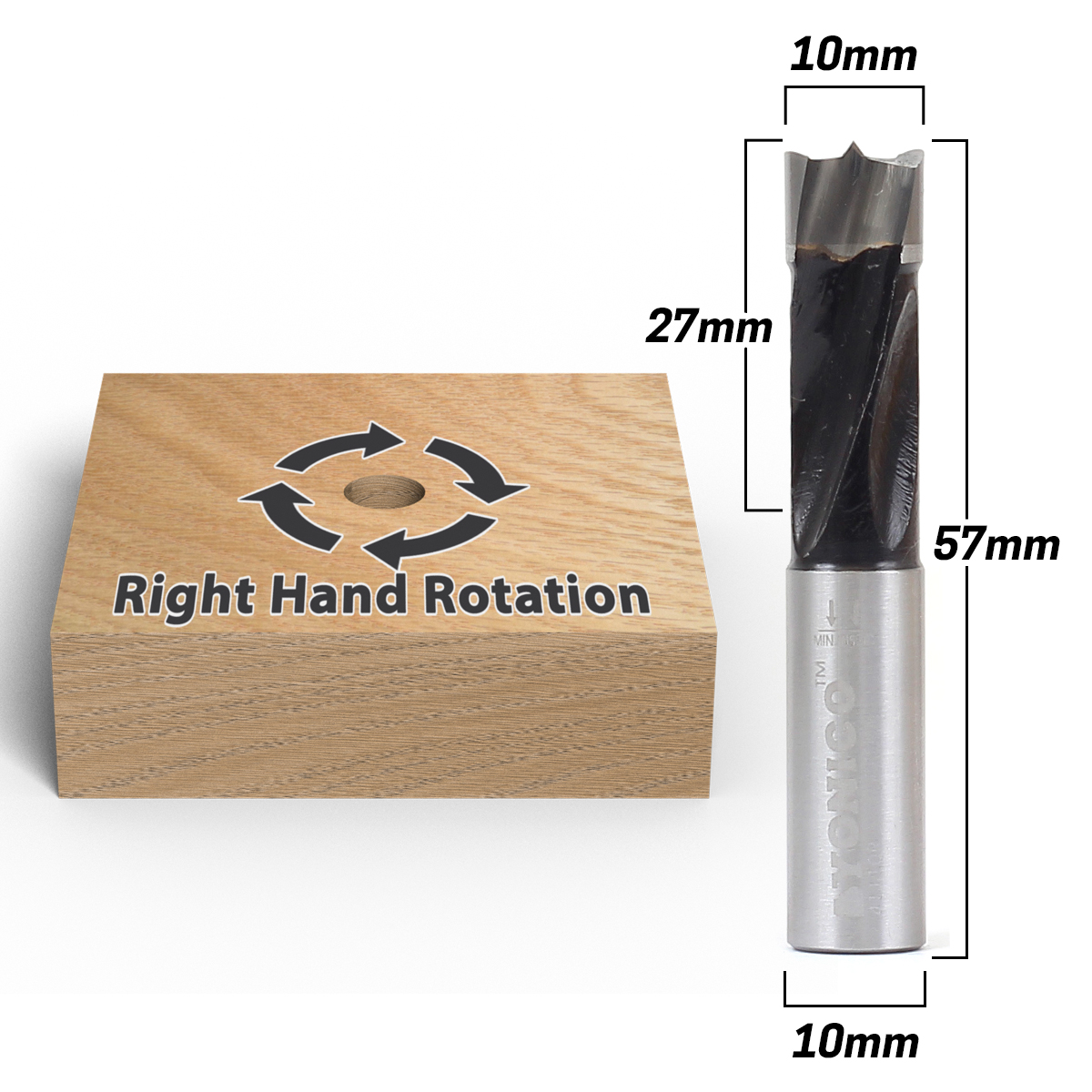 This right handed brad point boring bit has a 10mm diameter and a 27mm cutting depth. The shank is 10mm in diameter with a 20mm length. The shank also has a driving flat and a length adjustment screw.