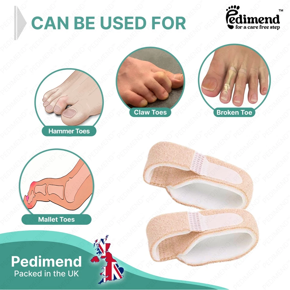 Product FeaturesBroken toes are painful, but the treatment process of buddy taping your toes together can add extra pain and discomfort to an already painful healing process. This cushioned fabric bandage takes some of the pain out of the 4 - 6 week broken toe healing process by acting as a removable, washable brace or splint. ALLEVIATE PAIN Lightly padded, the Toe Wrap provides protection for broken or hammer toes. The cushioning softness along the top reduces rubbing to alleviate pain and discomfort and allows blisters and sores to gradually heal. SICK TOE TREATMENT Pedimend™ Toe Splint can correct your hammer toe and bunion. As a new type of toe splint, it has no large size and ugly appearance of traditional products. You can wear all your shoes when you use it, even your high sandals heels. FINGER PROTECTION The fabric finger splint is the good choice for sprained, broken fingers, jammed fingers, bruising, dislocation and trigger finger. FOR FINGERS ✓ Treat your jammed, swollen, sprained, dislocated or broken fingers quickly and comfortably. ✓ These soft, easy-to-apply and non-slip loop straps hold two fingers together to protect and heal your injured fingers without messy tape or sticky straps. ✓ Finger splints also help treat mallet finger, trigger finger or thumb, and crooked fingers. ✓ As a finger guard, it can effectively provide cushion and reduce pressure on fingers, relieve pain cause by arthritis. ✓ The finger wraps protector can fully play a protective role in sports activities. TREATMENT FOR BROKEN AND HAMMER TOES Pedimend™ Toe Wraps are the superior solution for treating both broken toes and hammer toes. ✓ Straightens and stabilizes the toe during treatment ✓ Cushioned wrap protects the toe while helping it to heal ✓ Non-slip fabric is easy to secure, clean, and reuse ✓ Comfortable when wearing with shoes ✓ Toe Wraps are the superior broken toe and hammer toe treatment option ATTENTION: Please note this item is not suitable for Pinky Toes. NOTE: If you are not happy with the product or