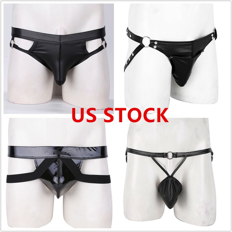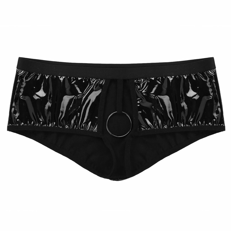 Men’s wet look patent leather sissy underwear panties, pull on closure.