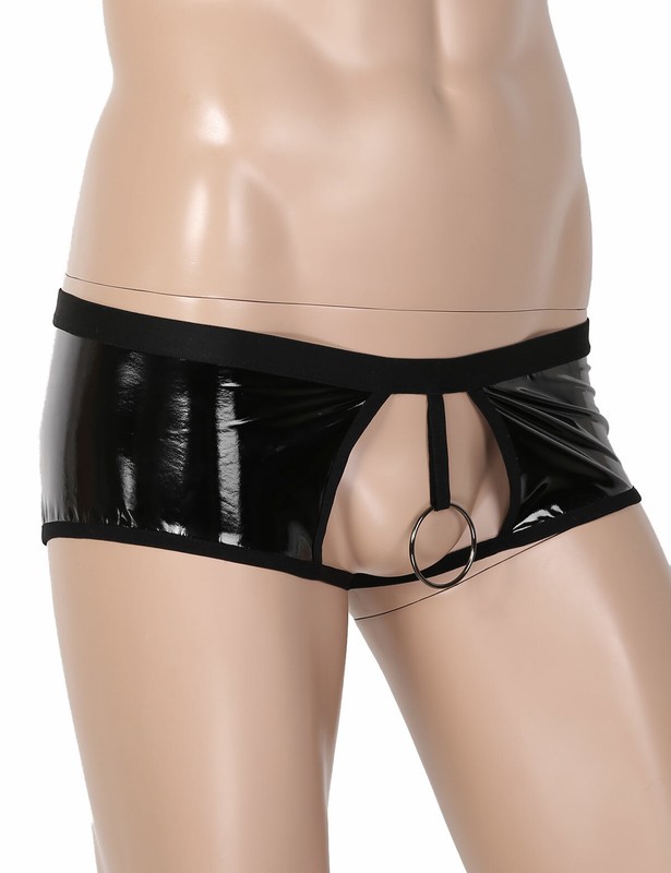 Men’s wet look patent leather boxer briefs shorts underwear, pull on closure.