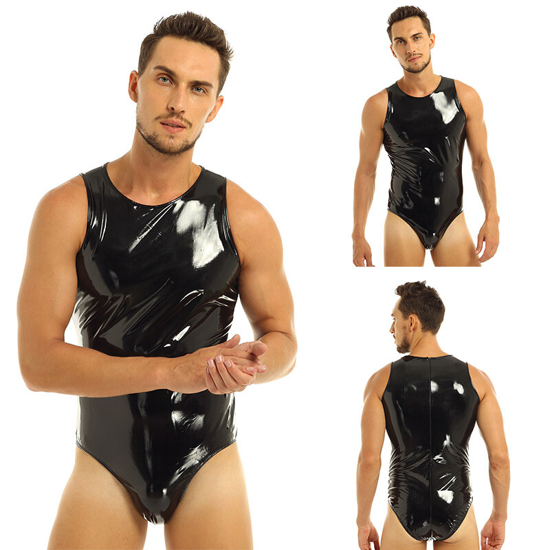 Men’s wet look patent leather bikini briefs underwear, pull on closure.