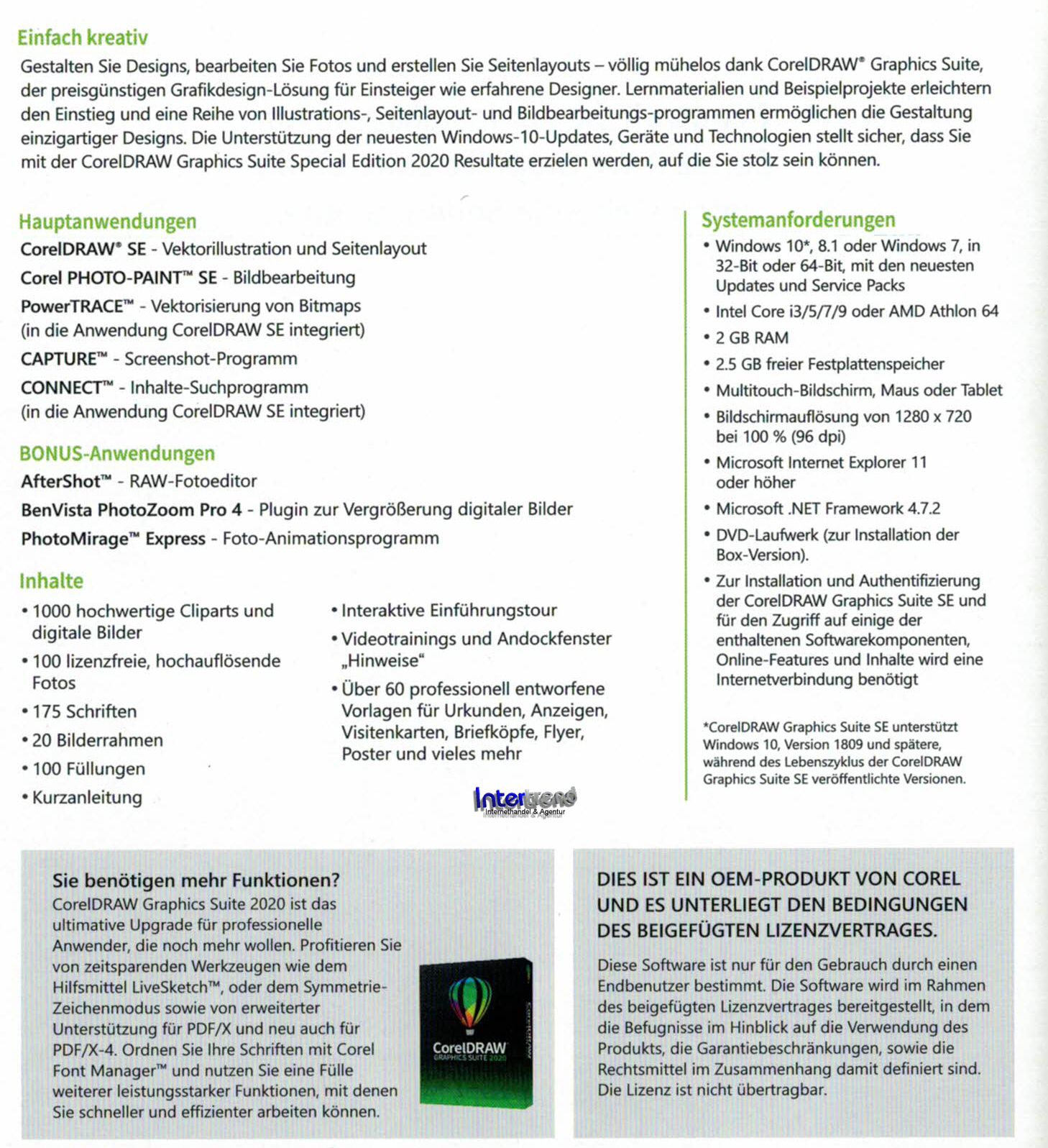 ________________________________________________________________________________________________________________________________________________ ___CorelDRAW Graphics Suite Special Edtion 2020 ___ Gestalten Sie Designs, bearbeiten Sie Fotos und erstellen Sie Seitenlayouts – völlig mühelos dank der CorelDRAW ® Graphics Suite, der preisgünstigen Grafikdesign-Lösung für Einsteiger wie erfahrene Designer. Lernmaterialien und Beispielprojekte erleichtern den Einstieg und eine Reihe von Illustrations-, Seitenlayout- und Bildbearbeitungsprogrammen ermöglichen die Gestaltung einzigartiger Designs. Die Unterstützung der neuesten Windows-10-Updates, Geräte und Technologien stellt sicher, dass Sie mit der CorelDRAW Graphics Suite Special Edition 2020 Resultate erzielen werden, auf die Sie stolz sein können. - Professionelle Cliparts - Geben Sie Ihrer Kreativität einen Schub mit 1.000 Cliparts für Ihre Designs und Projekte.