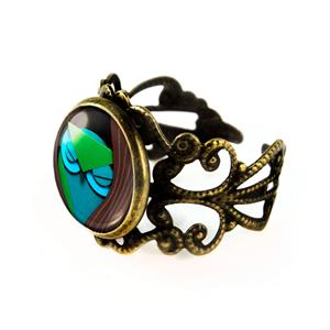 This gorgeous ring is hand-made from an adjustable antique bronze filigree ring-band and features a 12mm eye-catching center glass focal point. The design is crisp and vivid and is sealed under crystal clear domed glass. Rings are water resistant but not water-proof. Please remove before bathing or swimming. All rings come gift boxed.