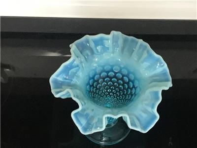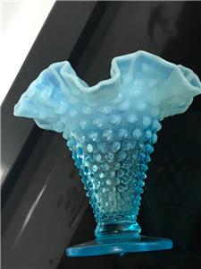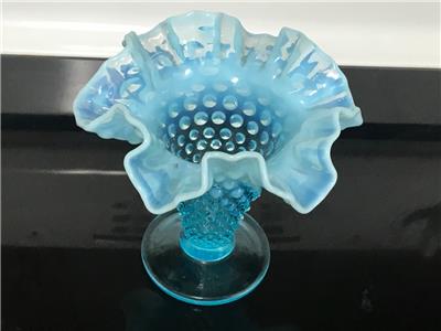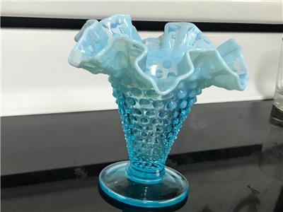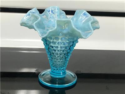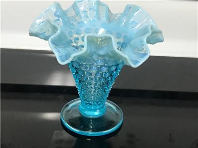 RARE Vintage FENTON Blue Opalescent Ruffled Hobnail Tall vase excellent 5 1/4". THIS IS 6" WIDE FROM RUFFLE TO RUFFLE.