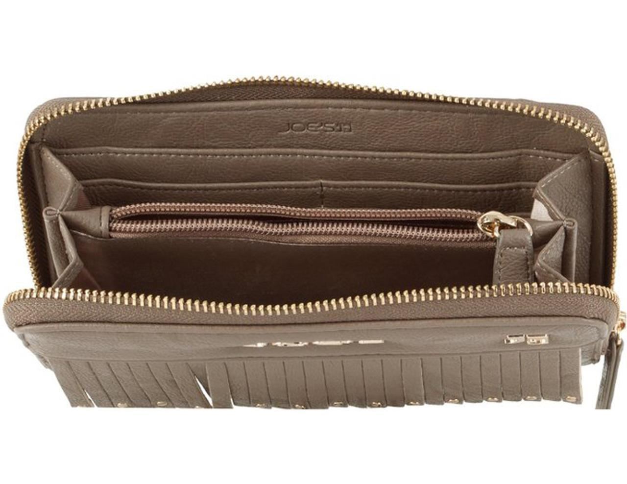 Carry your cash and cards in this classic Joe's Jeans Bronco Zip Around Wallet. Exterior Features Vegan leather, Studded Fringe design and Joe's Logo, Zip around closure, Interior features 8 credit card slots, 2 full length slip currency pockets, and a Center zippered coin pocket. This wallet offers storage for your currency and exceptional organization in sleek styling. Joe’s Jeans is a casual chic lifestyle brand known for modernized timeless styles from premium denim and collection pieces to contemporary accessories and footwear.