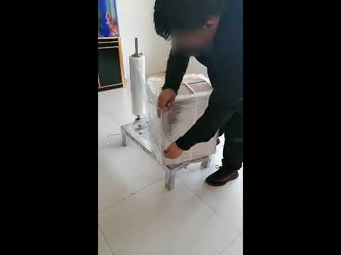 Table height is adjustable to match the box size, wrapping film holder is adjustable to fit several sizes up to 630mm width.
