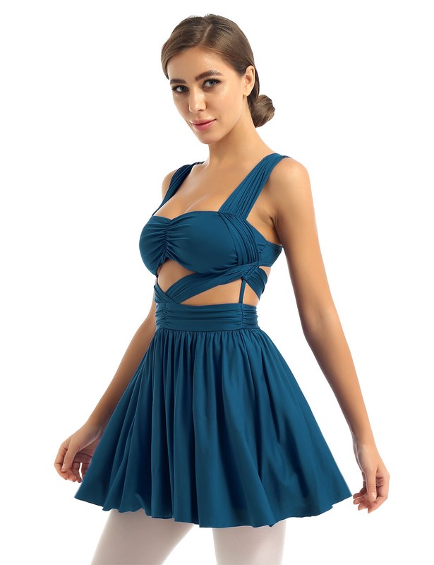Wide shoulder straps and square neckline, unique cutout top bodice with straps tie at back, flared hemline and above knee length.