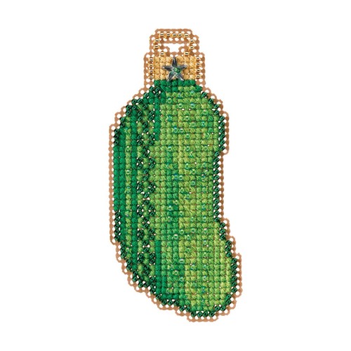 Christmas Pickle is just waiting to be found! Kit makes one beaded cross stitch Christmas Pickle Christmas ornament. Includes magnet to attach to metal frames, refrigerators, and similar items. Optionally, Velcro or pin back (neither included) may be glued to back and used to attach to clothing, greeting cards, gift packages, etc. The stitched piece may be hung with a loop of floss.