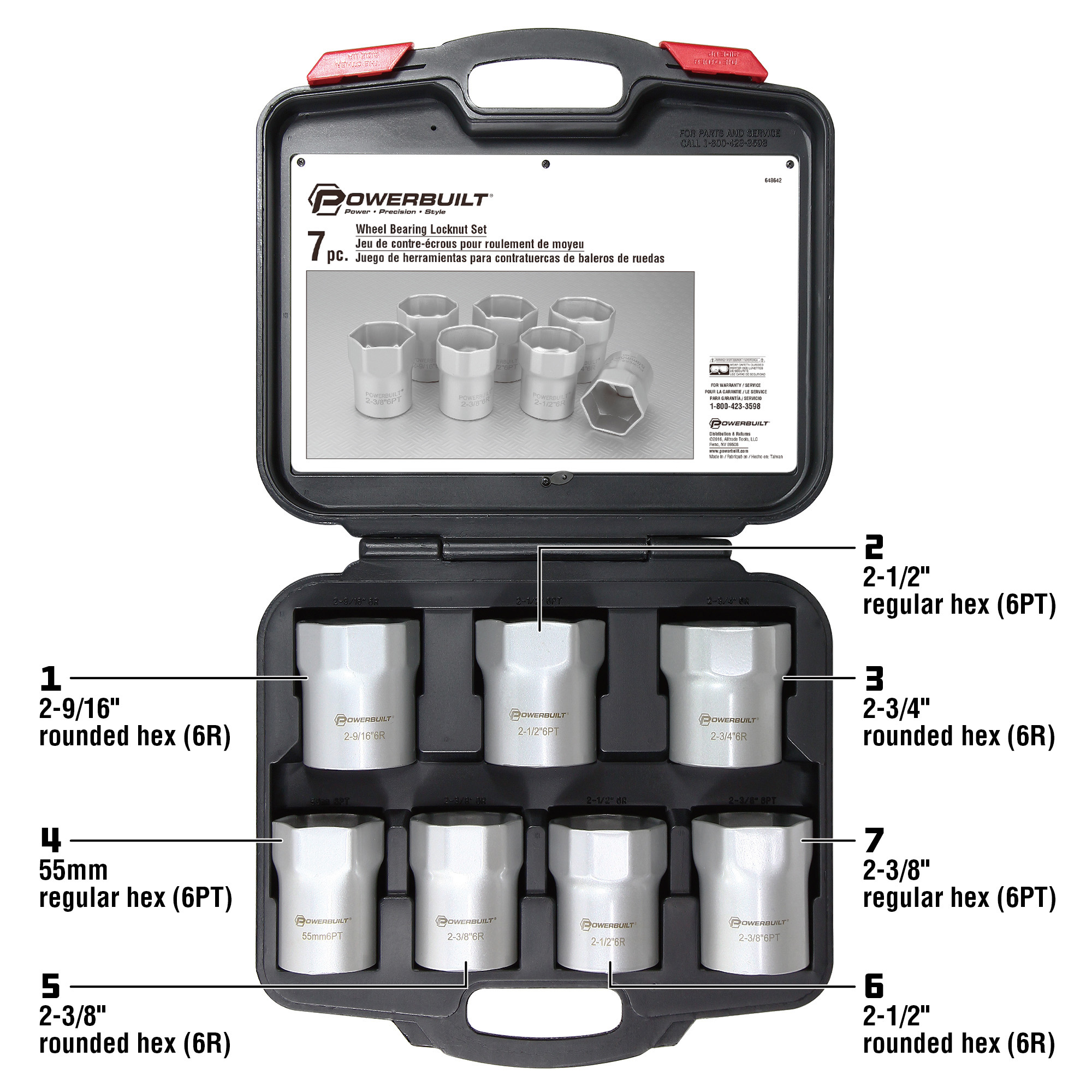 Bad wheel bearings on your truck or SUV can lead to costly repairs to surrounding components. Servicing wheel bearings to ensure the safe operation of your vehicle has never been easier. The Powerbuilt 7 Piece Wheel Bearing Locknut Set is the specialty tool kit you need to remove and install bearing locknuts on many trucks and SUVs, including Ford, Dodge, Ram, and Toyota. The extensive coverage makes this an ideal toolset for amateur and professional mechanics. The seven 1/2-inch drive carbon steel sockets are durable with 6-point and 6-round chamfered sockets for secure fitment on a wide selection of larger passenger vehicles. The sockets have large easy-to-read size markings for easy access and organization. Kit includes a heavy-duty carry case with usage photos and detailed instructions.