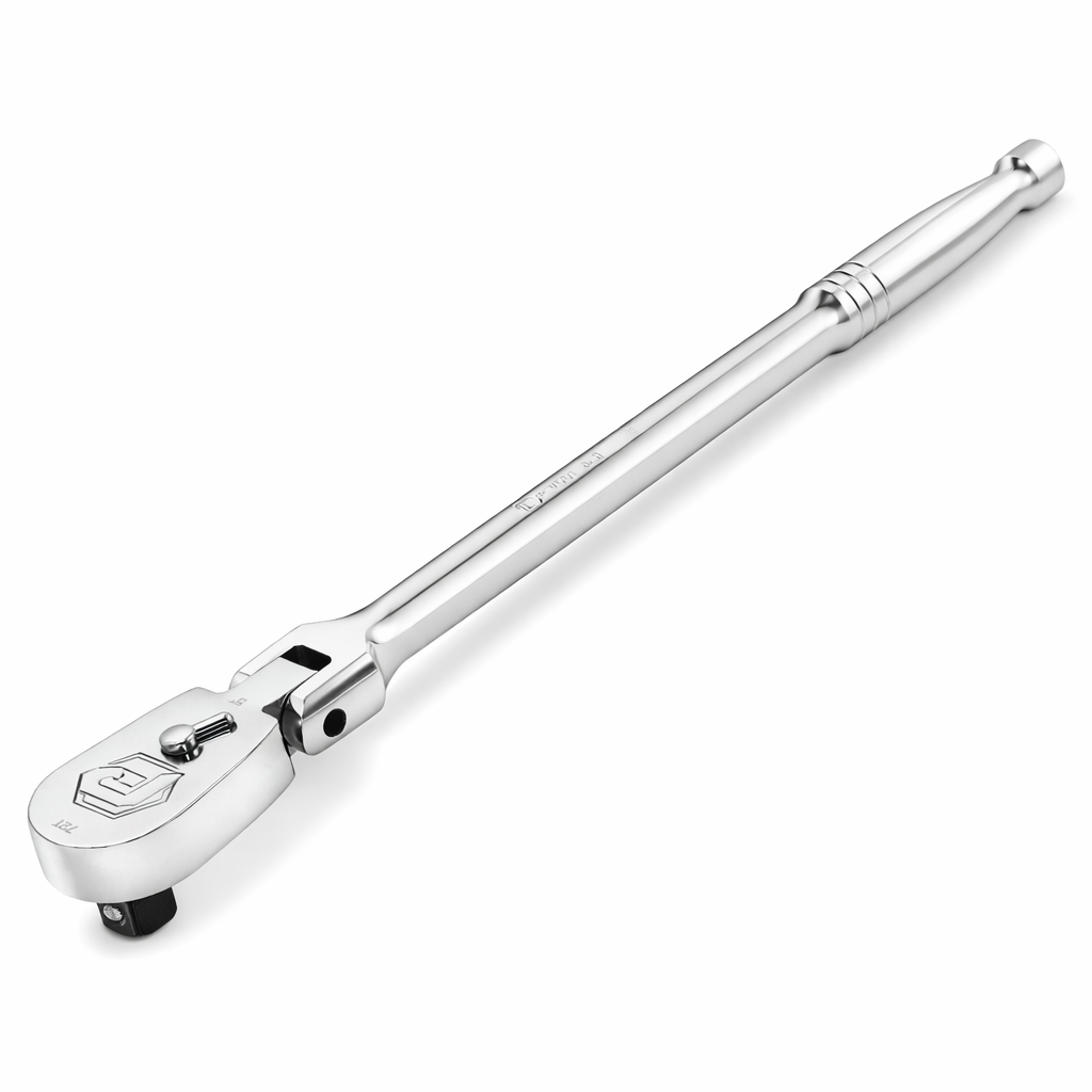 Built of strong Chrome Vanadium steel with a beautiful mirror finish, this 72-tooth sealed-head ratchet features a precision built gear-to-gear ratchet mechanism that is significantly stronger than conventional gear on pawl designs. The flex head design provides easier access to hard-to-reach spaces and the sealed head provides longer service life keeping out dirt and debris. The stylish full-length spiral-machined handle keeps your grip from slipping while you work. Precision crafted to exceed ANSI standards for quality and performance.