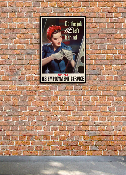 for jobs to aid in the war effort. It shows a "Rosie the Riveter" type of woman