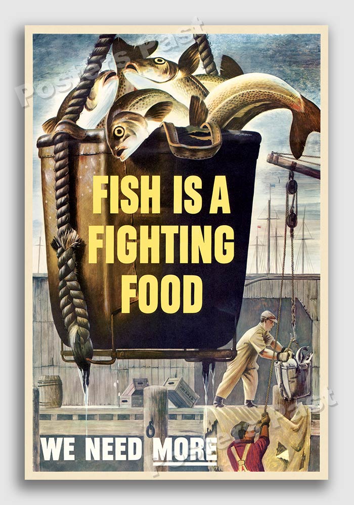 dock. The poster reads: Fish is a Fighting Food - We Need More.