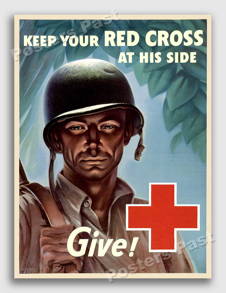 setting. The poster reads: Keep Your Red Cross At His Side - Give