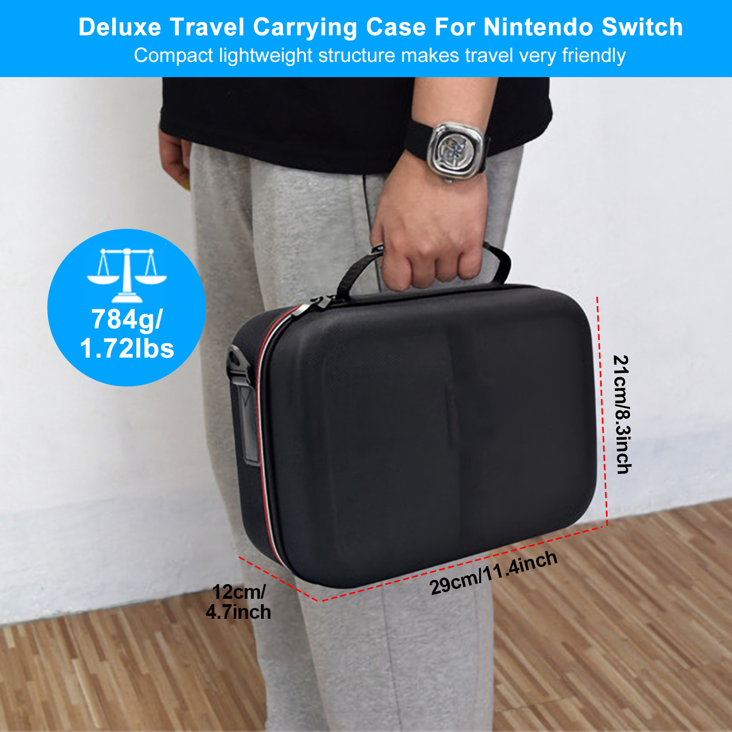 Overview:This hard EVA case shipshape organize your console, joy-cons/joy-con straps, game cards, charging adapter, earphones, cables and game cards in different compartments, easy to open and get what wants. Also, it effectively protects the game player and accessories from bumps, shocks, drops, impact, scratches, dust, dirt, moisture and splashes etc. Moreover, it comes with a rubberized handle and shoulder strap, convenient double carrying ways when travel. A good companion for game enthusiasts.