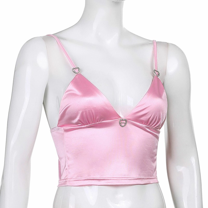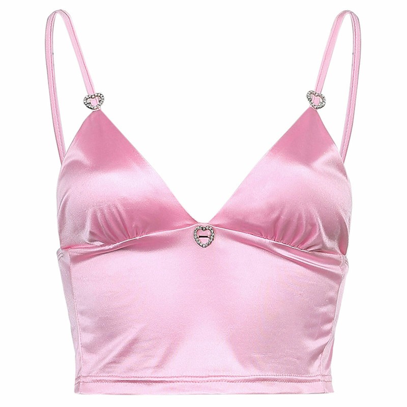 Women Fashion V Neck Satin Camisole Backless Crop Top Rhinestone Heart Decor Vest.