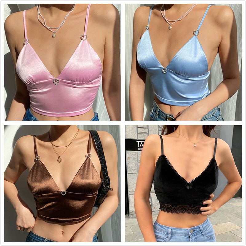Women Lace Trim Hem Velvet Crop Top Summer Fashion Solid Color V Neck Backless Camisole Vest Tops.