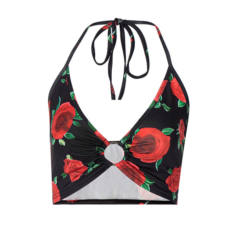 Women Flower Print Lace Trim See-through Mesh Camisole V Neck Backless Spaghetti Strap Crop Top.
