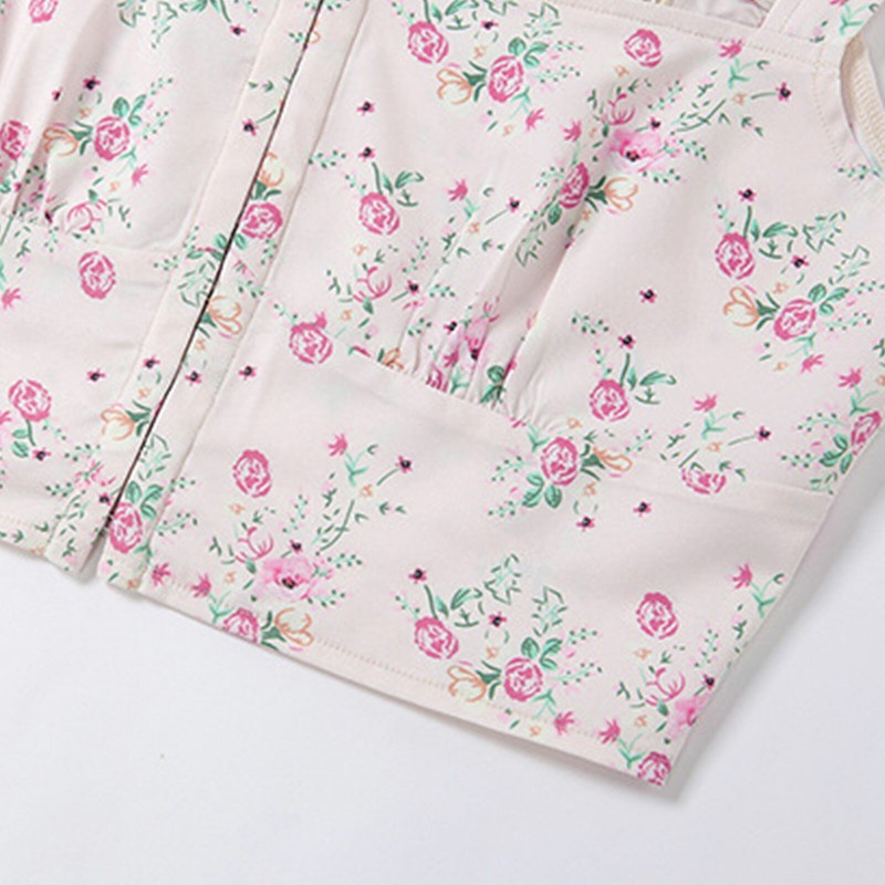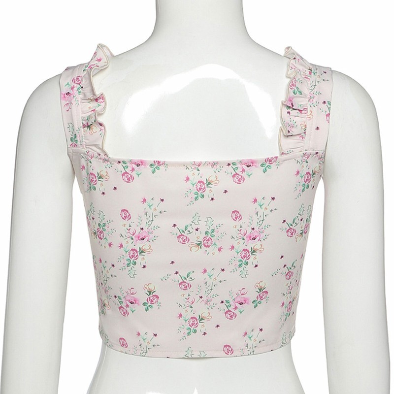 Women Floral Print Ruched Crop Top Summer Square Neck Front Closure Camisole Vest.