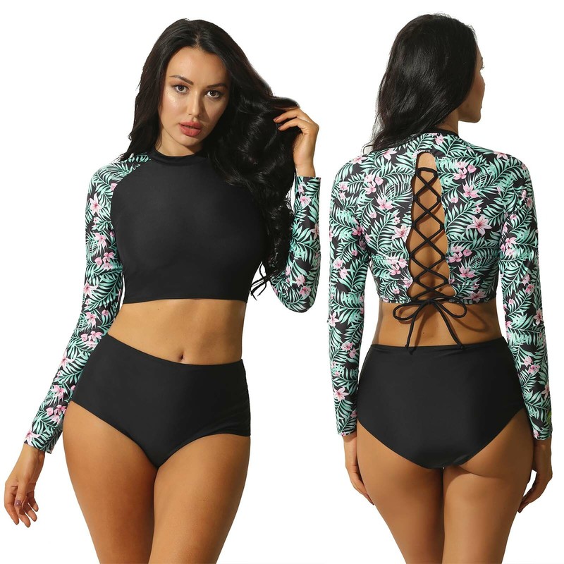 Women Bathing Suit Floral Print Long Sleeve Rash Guard Crop Top with Ruched Triangle 2 Piece Tankini Set.