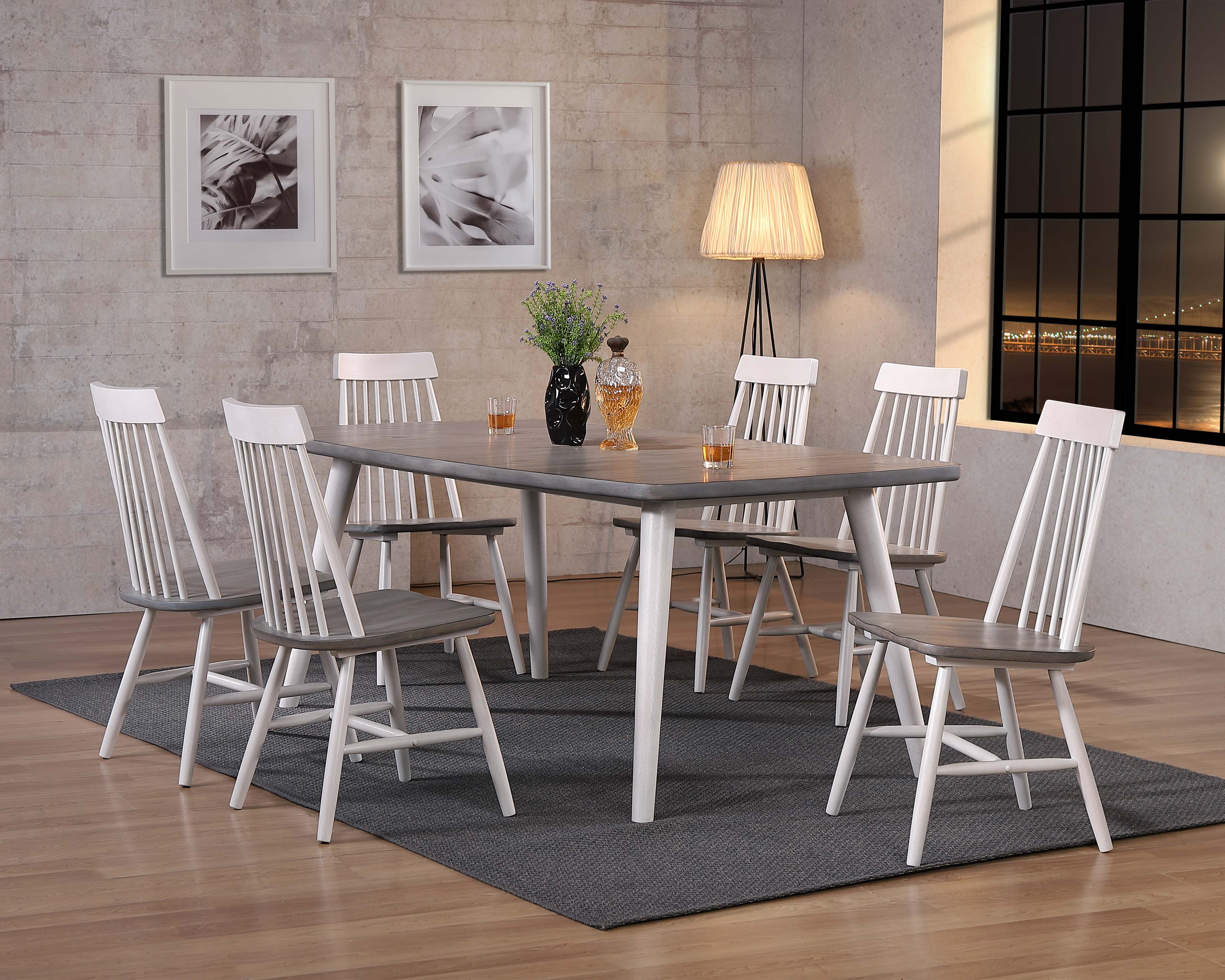 Features include a white and gray finish which blends well with any decor, round legs, and stylish slat back chairs.