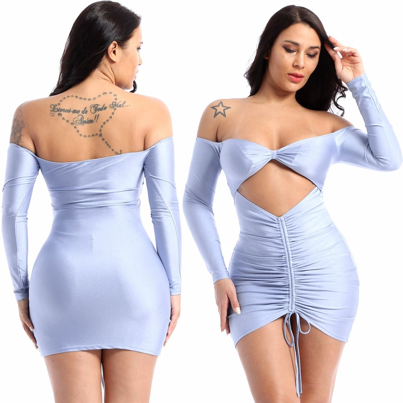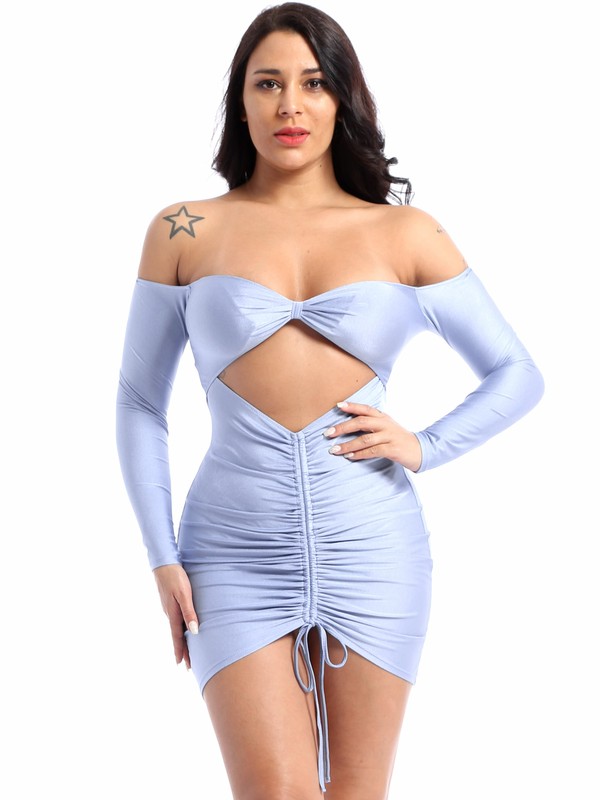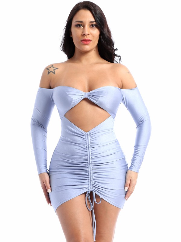Women Fashion Off Shoulder Long Sleeve Cutout Dress Drawstring Front Ruched Dresses for Club Cocktail Party.