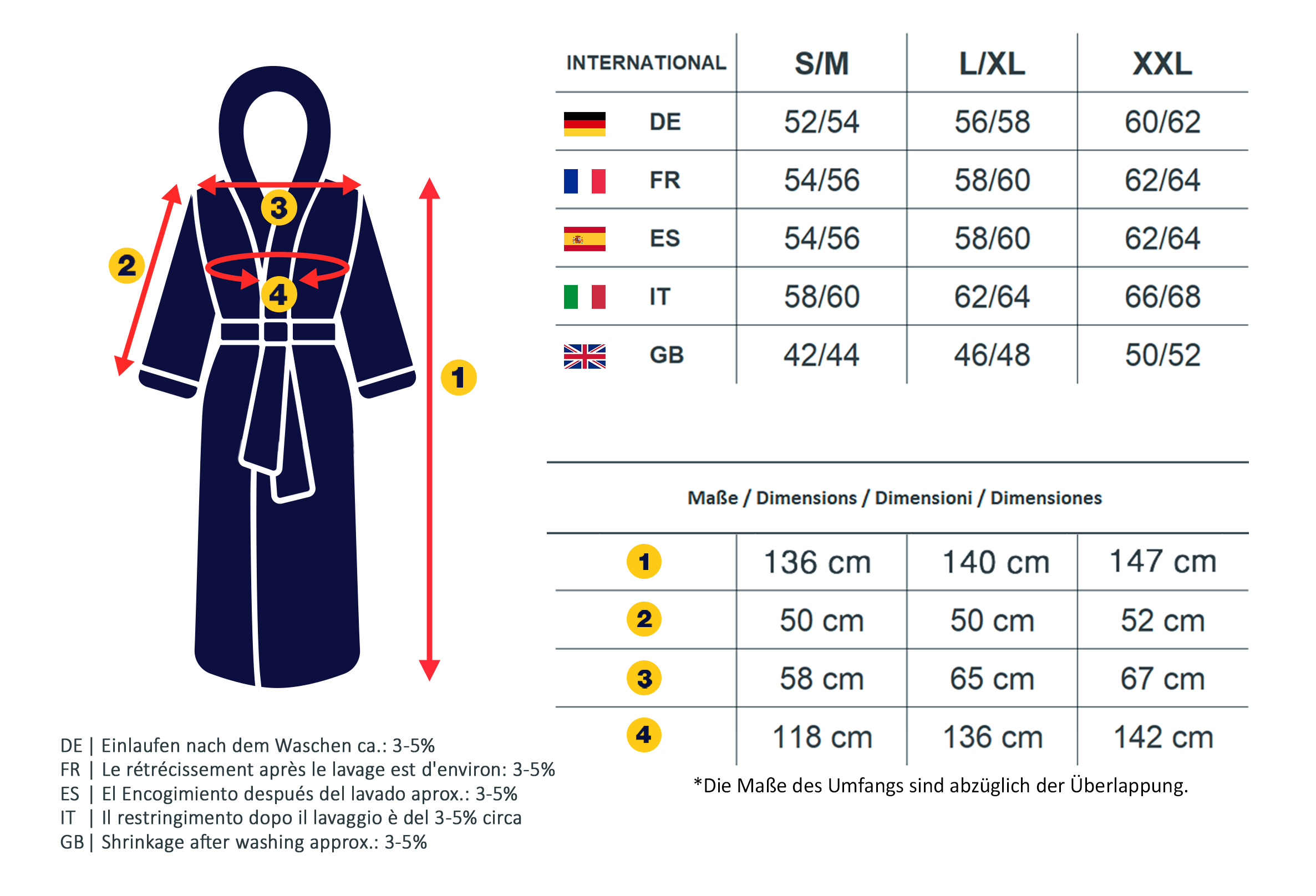 Die Maße der gelieferten Waren dürfen bis zu zwei Prozent von den angegebenen Maßen abweichen. Bitte berücksichtigen Sie, dass der Frottee beim Waschen ca. 5 - 7% einlaufen kann.