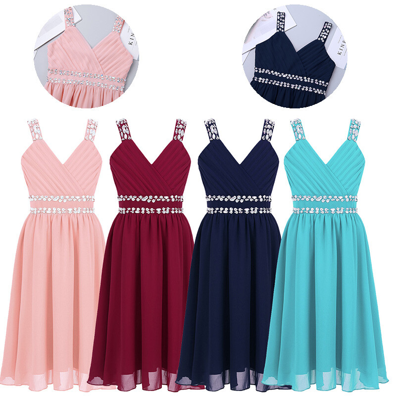 Hidden back hip zipper closure. 2 layers dress, top chiffon layer with 1 lining. Beautiful and stylish dress for your girl.