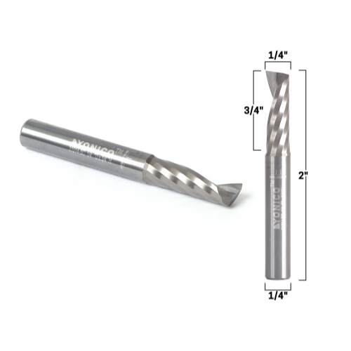 This O-flute bit has a cutting diameter of 1/4", cutting height of 3/4", overall length 2" and 1/4" shank.