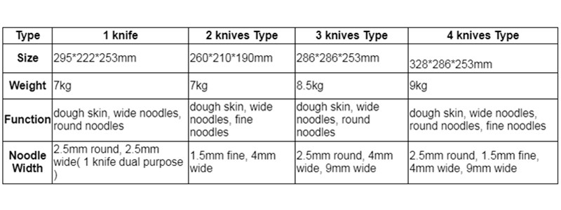 Pasta Machine with 4 PCS Noodle Blade Material: Stainless Steel Weight: 9kg Power: 135W Voltage: 110V Size: 328*286*253mm Noodle Width: 1.5mm fine, 2.5mm round, 4mm flat, 9mm wide Dough Pressing Thickness: 0.3-4mm Package Included: