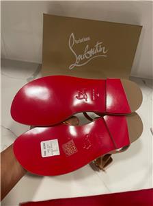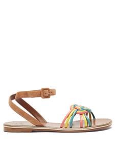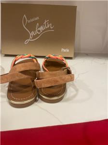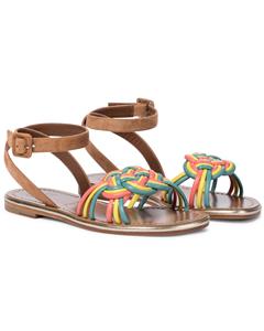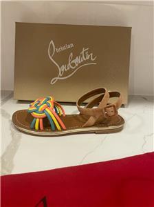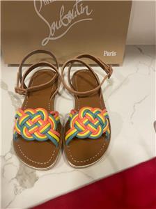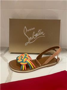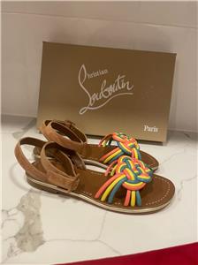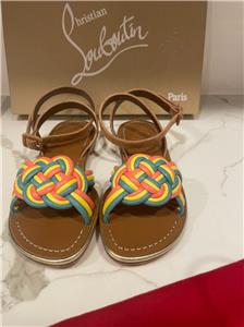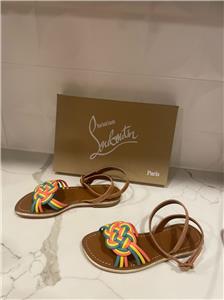 - Christian Louboutin "Ella" braided napa leather sandals. Flat heel. Open toe. Adjustable suede ankle-wrap strap. Signature red leather outsole. Made in Italy. Designer color: Multi.