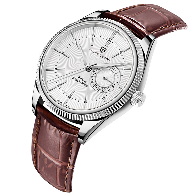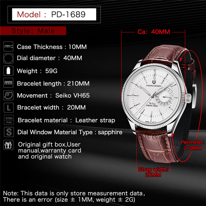 Description: Brand:PAGANI DESIGN Movement:Seiko VH65 Quartz Band Material:Leather Case Material:Stainless Steel Dial Diameter: 40mm Case Thickness: 10mm Maxi Perimeter: 210mm Band Width: 20mm Water Resistant: 200M Dial Window Material Type:Sapphire Package Includes: 1 x Original Watch 1 x User Manual 1 x Watch Box