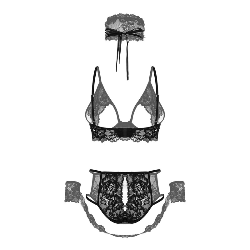 Hollow out unlined bra, pair with a crotchless G-string, a pair wristband and an eye mask.