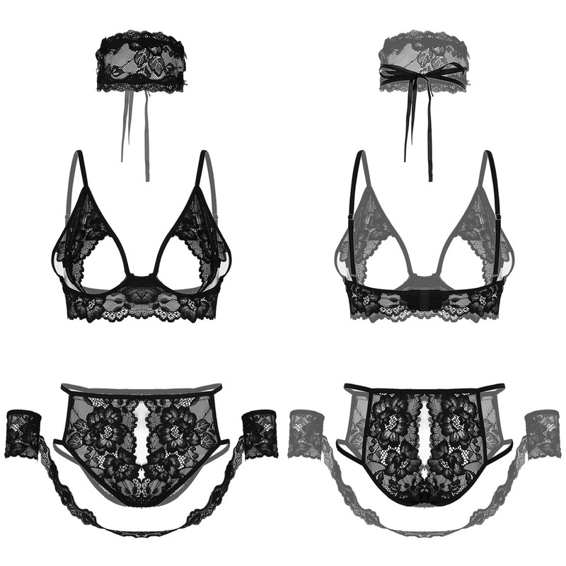 Women Four-piece Lingerie Set Underwear Hollow Out Bra with Crotchless G-string Wristband Eye Mask.