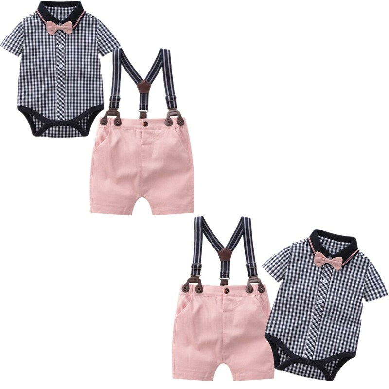 3pcs kids boys gentleman outfit set short sleeve button down lapel shirts with bow tie detachable suspenders pants sets for party wedding.
