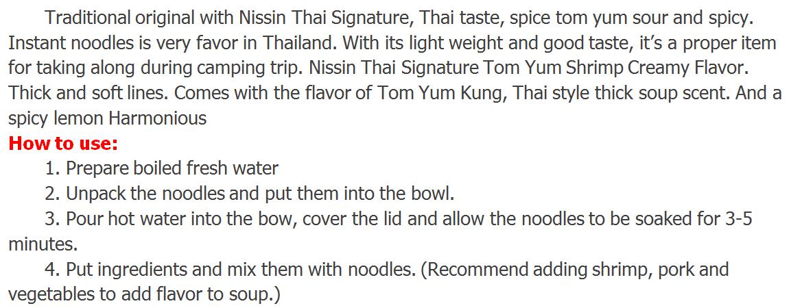 | | | 2 x Nissin Instant Noodle Thai Signature Tom Yum Shrimp Creamy Flavour 72g. | Shipping Details: - The item will be shipped worldwide next business day after the money has been transferred to my Paypal account and you should received in 2-4 weeks. The item will be posted by airmail from Thailand in well package and send by Non-Registered airmail.