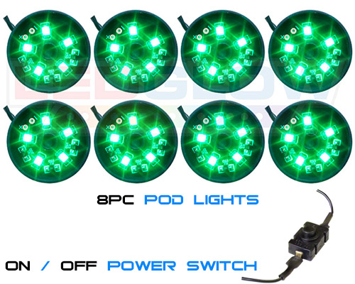 LEDGlows 8pc Green SMD LED Pod Motorcycle Lights add a spotless glow to any motorcycle by utilizing vibrant SMD LED technology. This motorcycle accent lighting kit features (8) ultra-bright pods with 5 SMD LEDs each and an ultra-thin profile at 1.25 in diameter and .30 thickness. Add subtle, crisp green lighting that showcases the contours of your Harley, Yamaha, Ducati and more at night without taking up a lot of space on your bike.