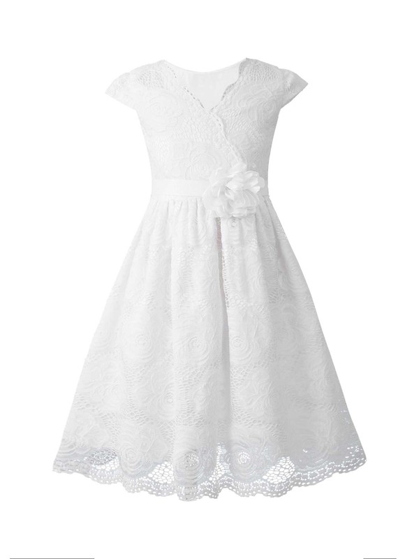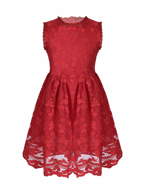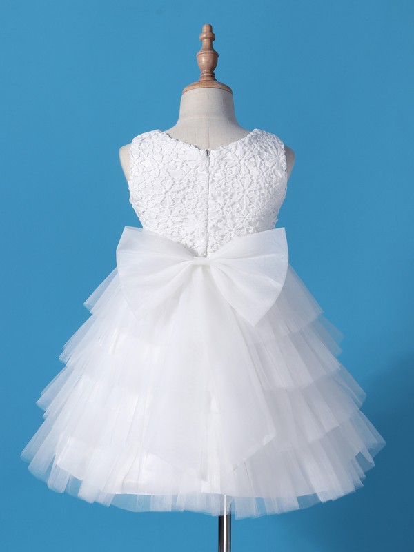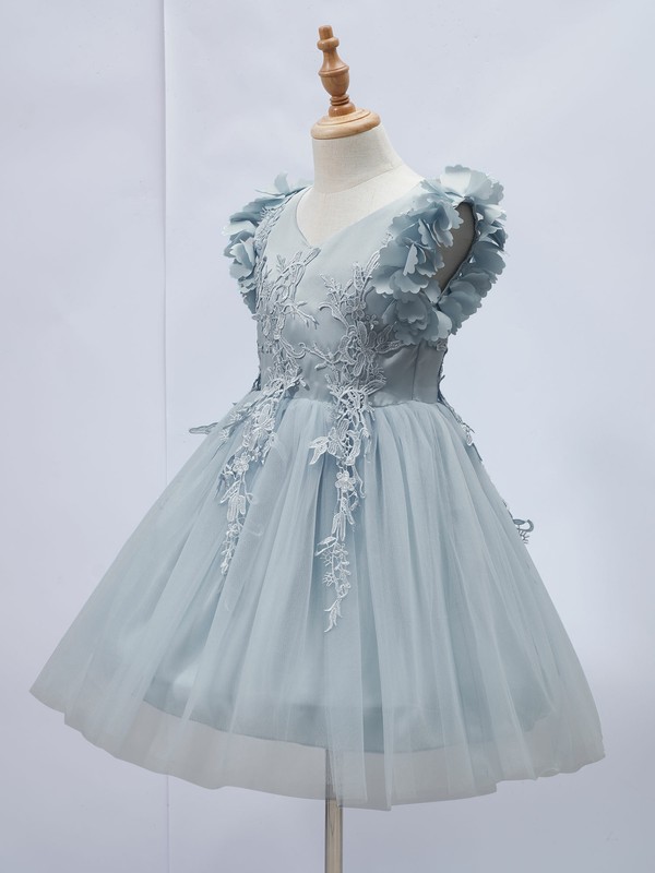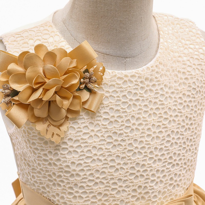 Round neck, sleeveless, a 3D Applique flower on one shoulder, bowknot at front waist, hollow floral layer on top and spliced with satin hem, back zipper closure.