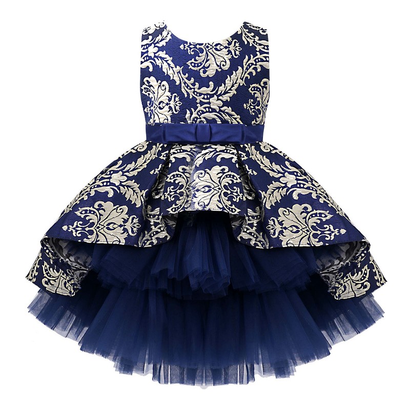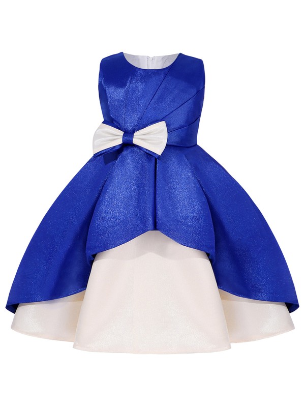 Kids girls applique satin dress round neck sleeveless bowknot hollow floral layer patchwork fluffy dress for party birthday.