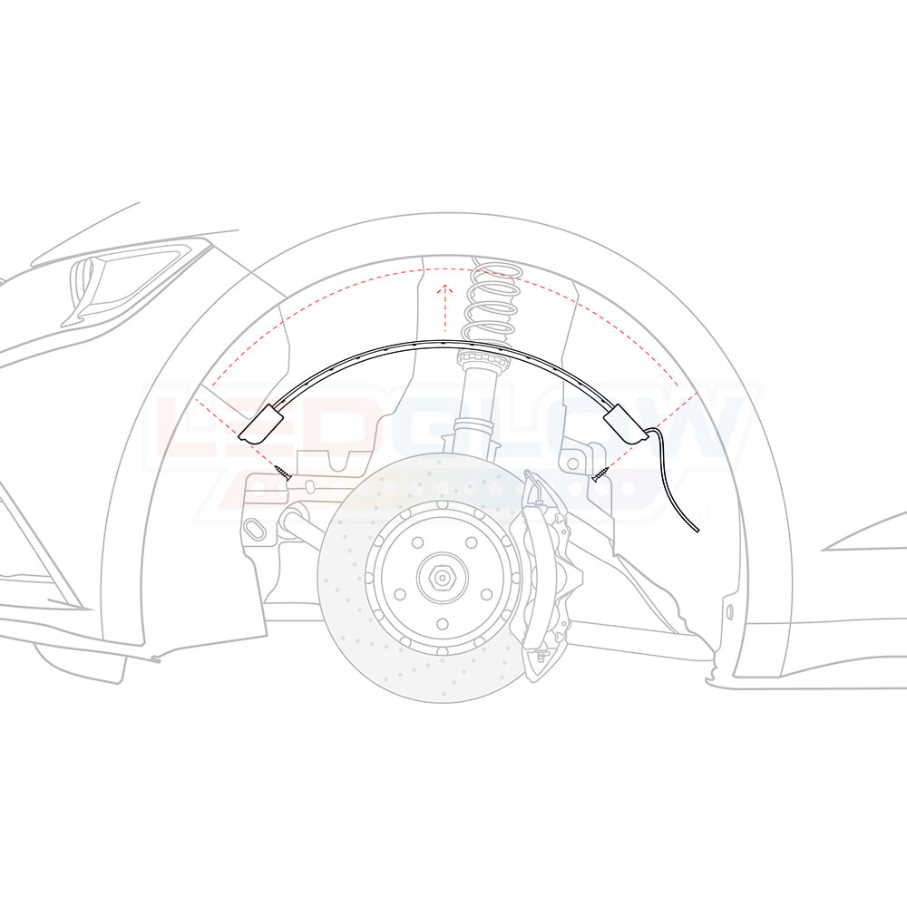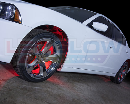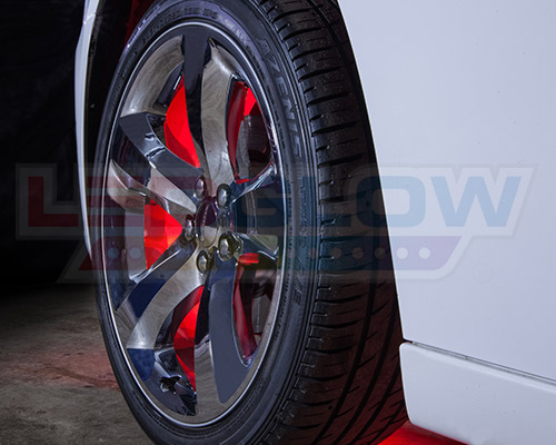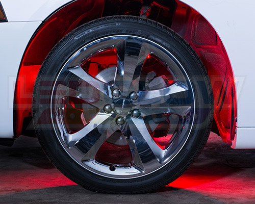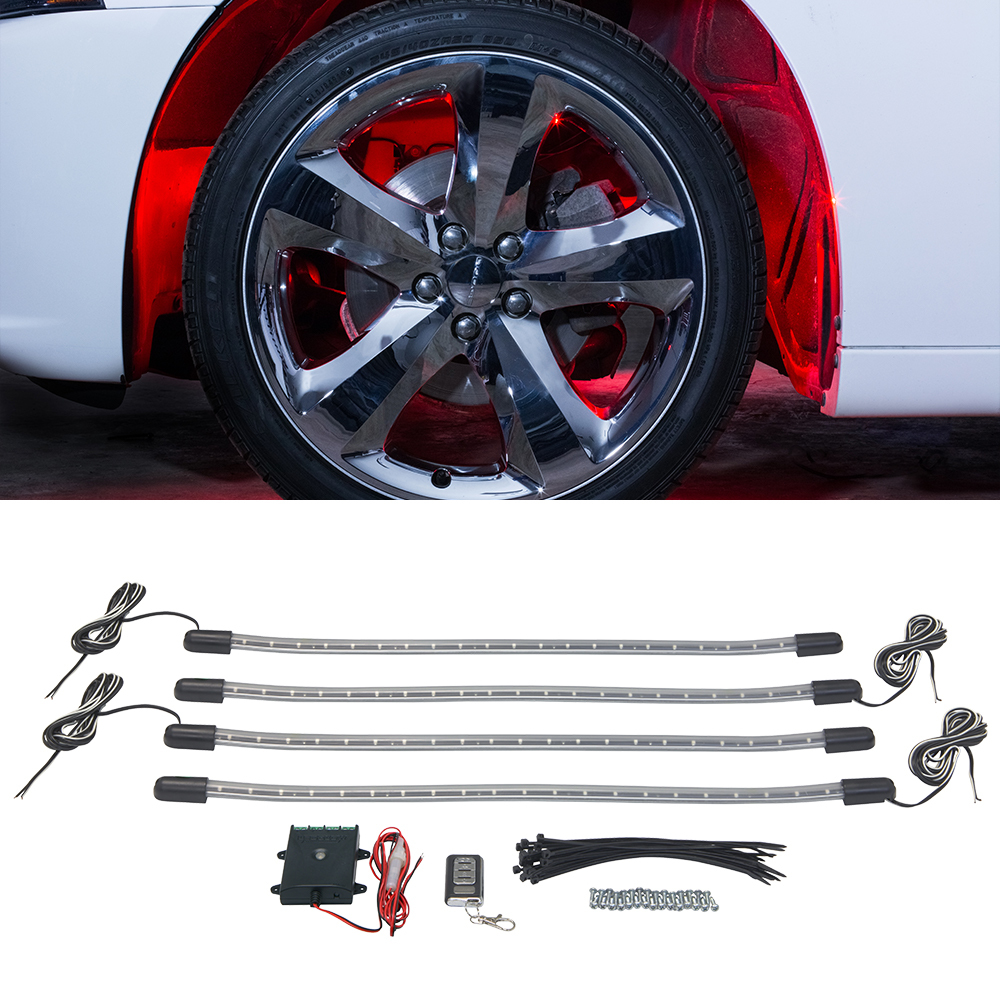 LEDGlow's Red Wheel Well Light Kit features 84 SMD LEDs housed in (4) 24 flexible tubes that are easily mounted either above the tire to the fender well to illuminate the wheels, or behind the strut to illuminate the rims. The wireless remote allows you to select from a range of modes including solid color illumination, 3 fade modes, 3 strobe modes and a sound activation mode that reacts to the music playing inside your vehicle with the built-in microphone. The wireless remote features an operating range of 50.