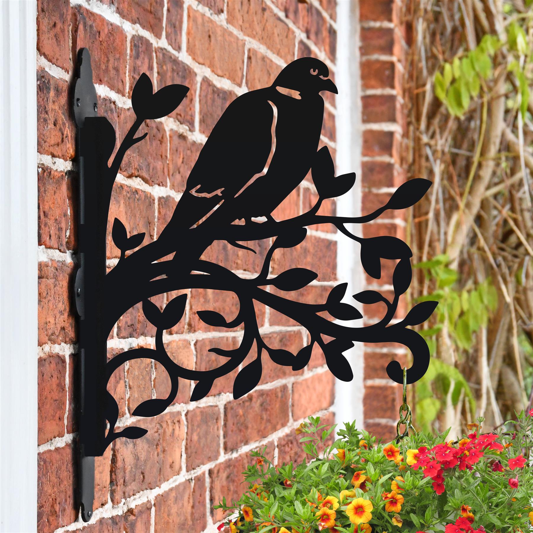 Crafted from high quality steel and finished in a sleek midnight black finish, this fun and quirky hanging basket bracket features the silhouette of a wood pigeon perched upon an assortment of branches. Highly detailed throughout from beak to leaf, this hanging basket comes complete with integrated hanging hook and matching backplate for easy installation to the desired exterior wall. Full of nature and design, this hanging basket bracket is a work of art and would look fantastic when on display all year round.