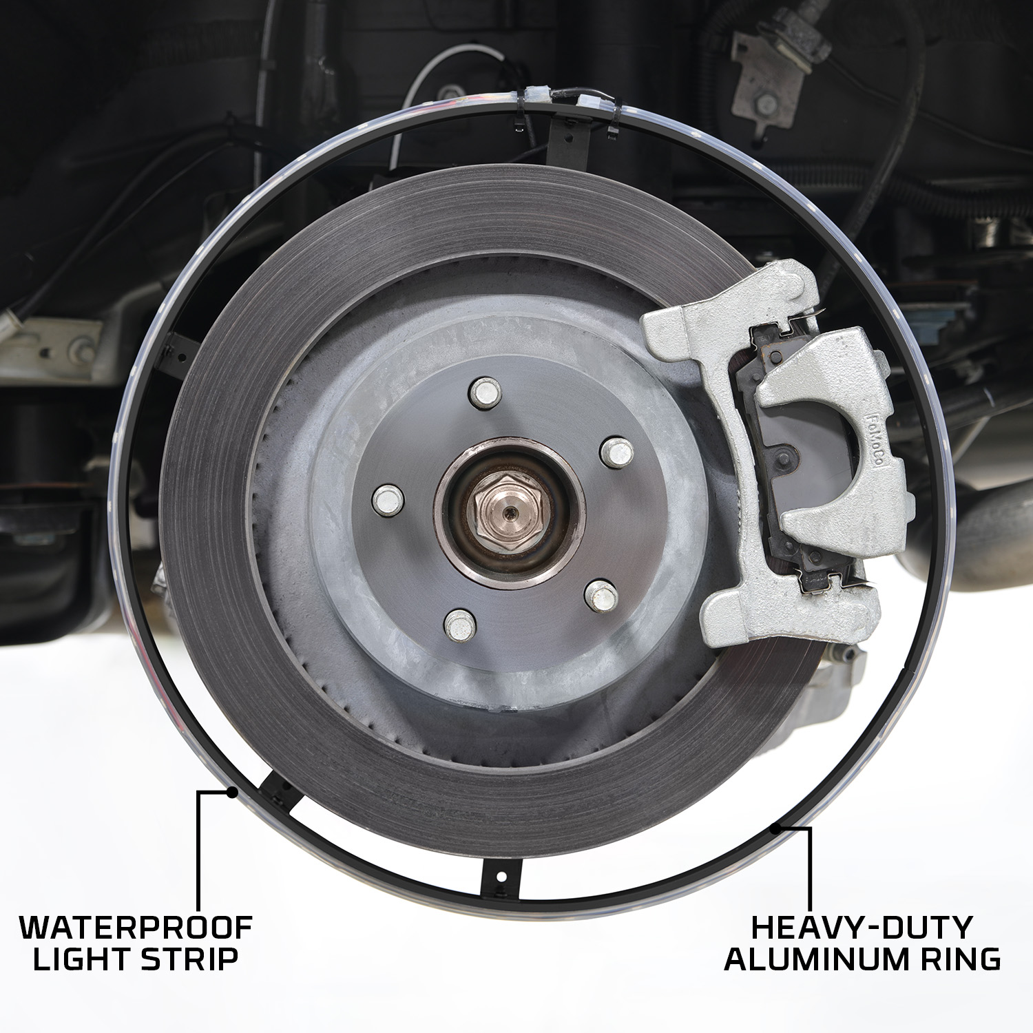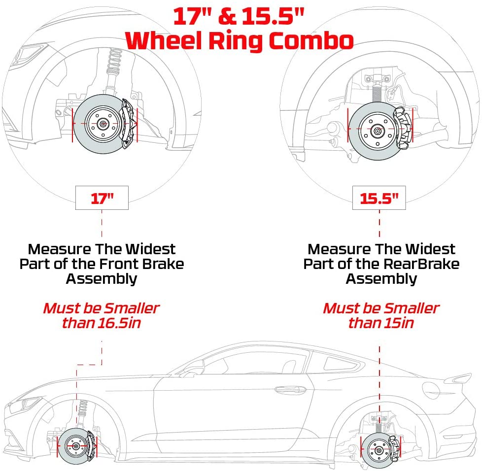 Our wheel ring lights are offered in 3 different sizes: 14, 15-1/2 and 17. In order to select the correct wheel ring size for your vehicle, you need to measure the overall diameter of your brake assembly for both the front and rear wheels. The wheel ring must be larger than the diameter of your brake assembly, but smaller than the inner diameter of your wheels.