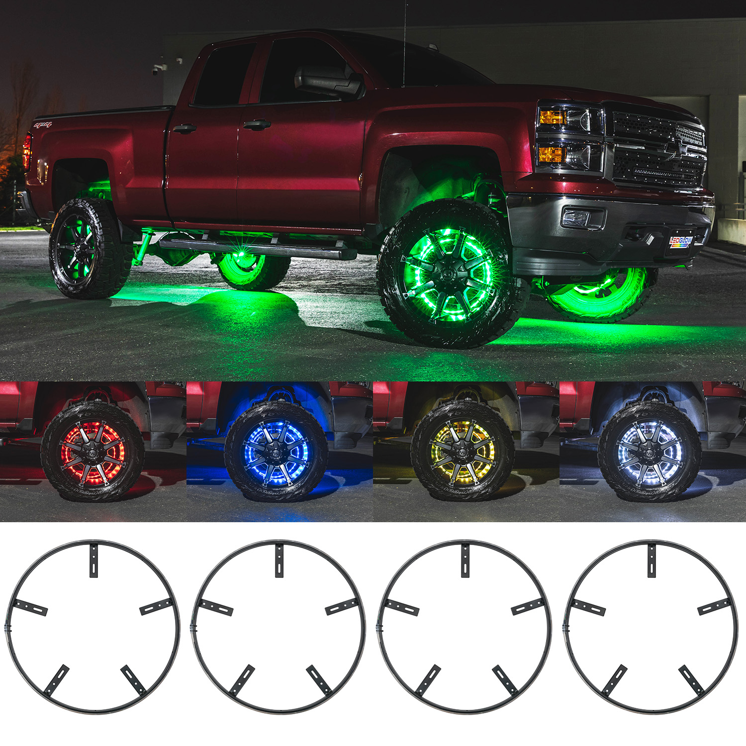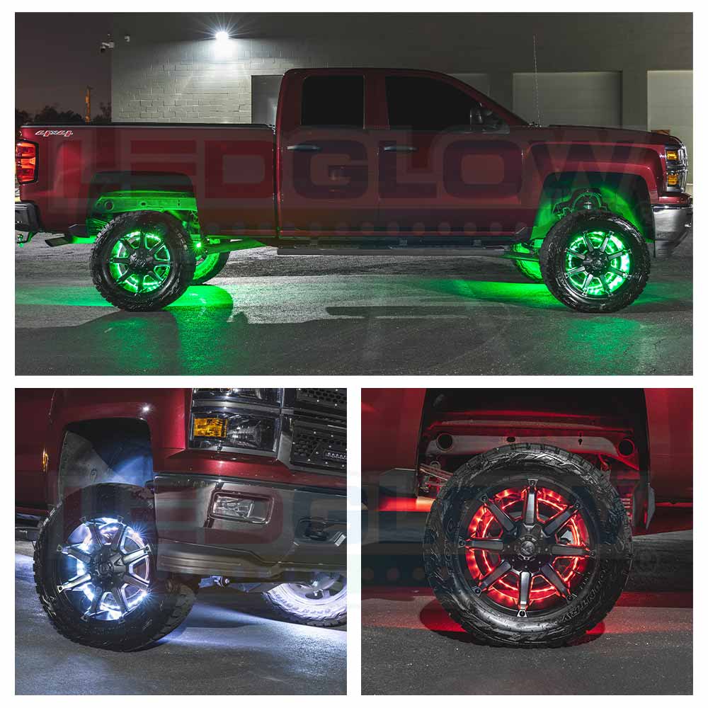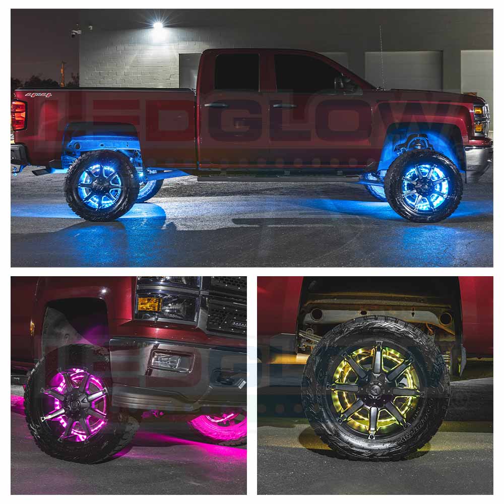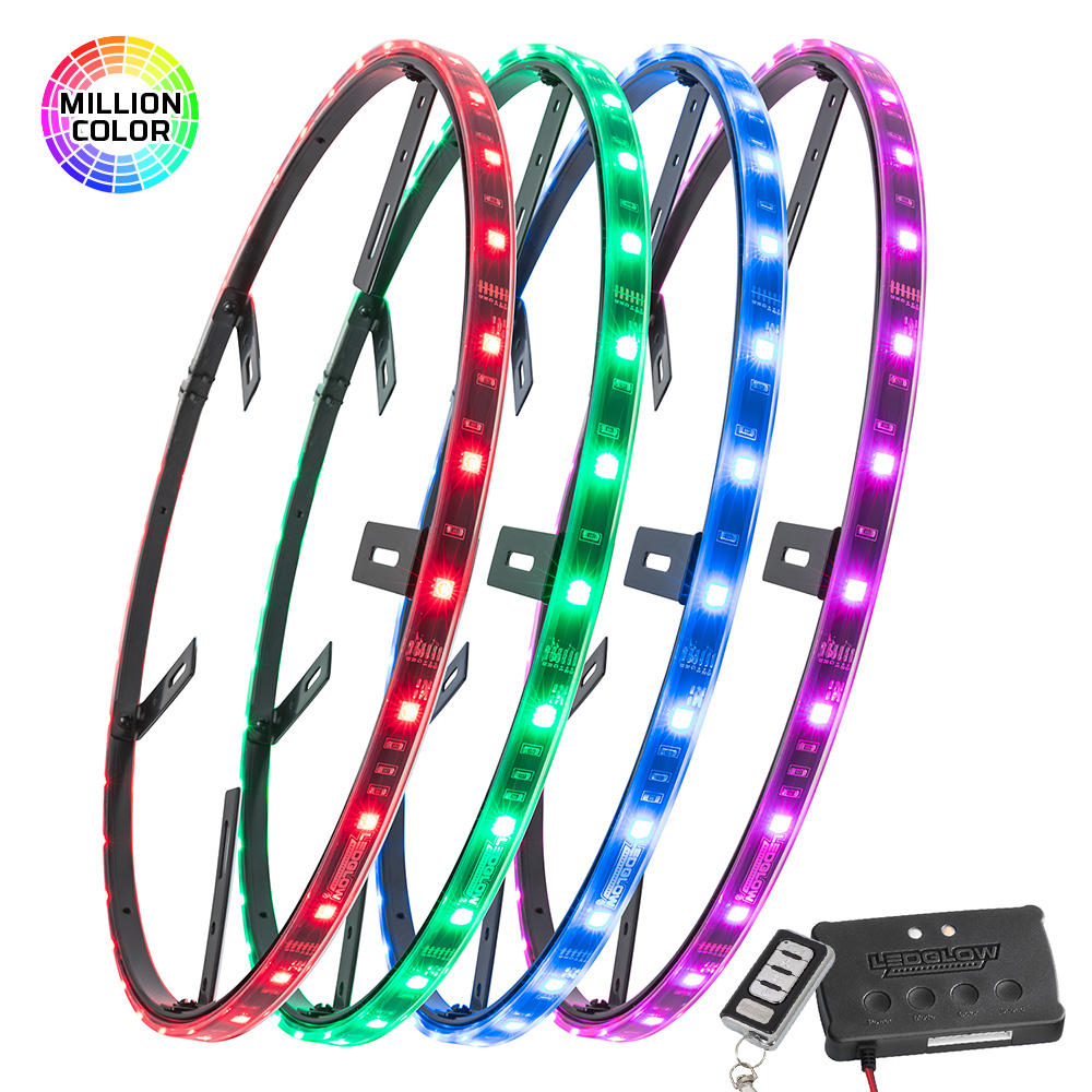 LEDGlows 4pc 15-1/2 & 17 Million Color LED Wheel Ring Light Combo Kit illuminates your car or trucks wheels with multiple solid color options and a wide range of lighting effects. These LED wheel ring lights are sized for wheels with diameters of 20 or larger and 21 or larger respectively, and install directly to the dust shield or hub assembly and allow 5050 SMD LED lights to shine directly through the wheel. This combo kit includes (2) 15-1/2 and (2) 17 wheel rings. Each 15-1/2 ring features a 50-1/4 waterproof strip with 36 SMD LEDs per strip, and the 17 ring lights feature 55 waterproof strips with 39 SMD LEDs per strip. The kit includes brackets, mounting hardware, zip ties and much more for installation.