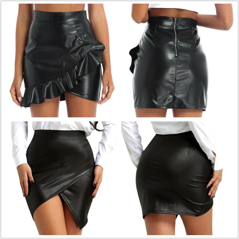 Women’s faux leather bodycon mini skirt, solid color.