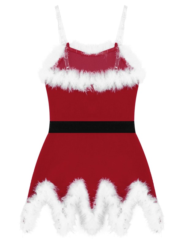 Kids Girls Christmas Costume Invisible Straps Sleeveless Pompoms Adorned Irregular Hem Cami Dress.