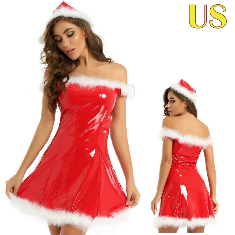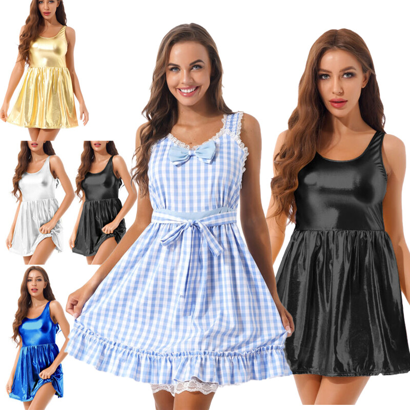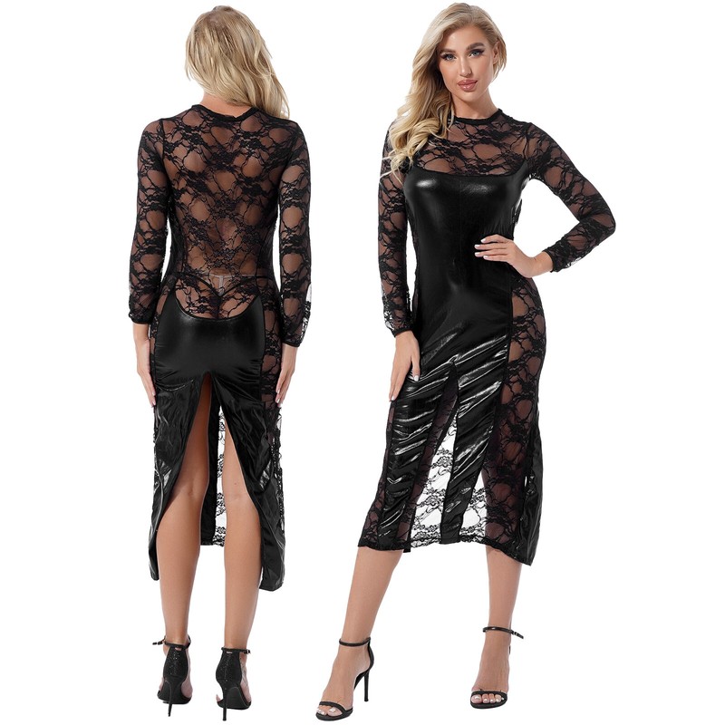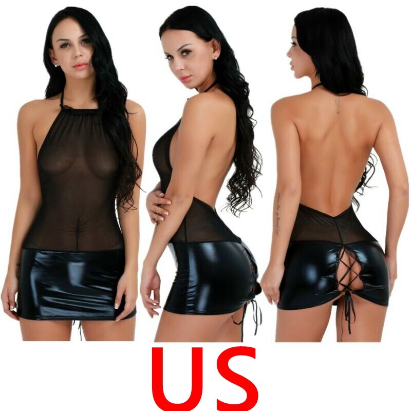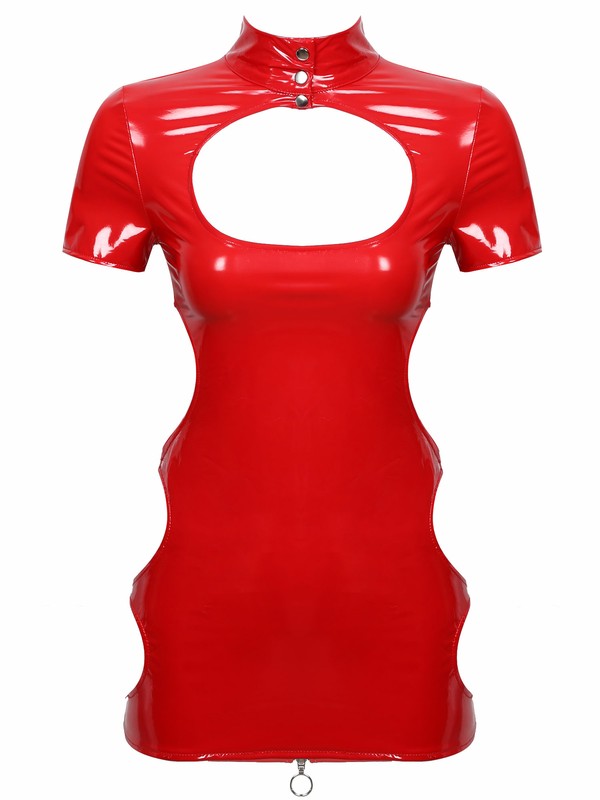 Ladies shinny patent leather mini dress, wet look appearance.